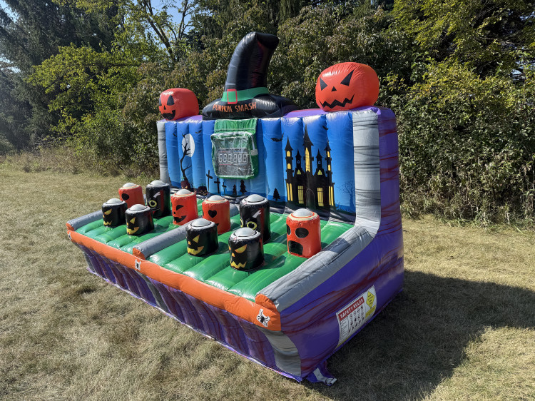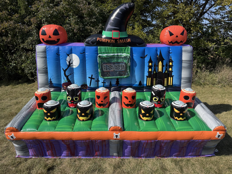 Pumpkin Smash Light System — a spooky, family‑friendly carnival game rental that brings fast, competitive fun to Halloween parties and fall festivals. This self‑contained inflatable play station features a raised playfield decorated with jack‑o’lanterns, witches’ hats, and haunted artwork, with multiple pop‑up pumpkin targets and smaller cylinder targets arranged in lanes. Players race to “smash” or hit the illuminated targets — the light system highlights active targets and keeps score or paces rounds so even large groups can take turns quickly and clearly. Built for short bouts of energetic play, it’s sturdy, easy to set up on grass or pavement, and sized for kids and teens (supervision recommended for younger children). Great as a focal attraction for seasonal events, it combines bright visuals, sound/light cues, and simple rules to create instant excitement without complicated instructions.